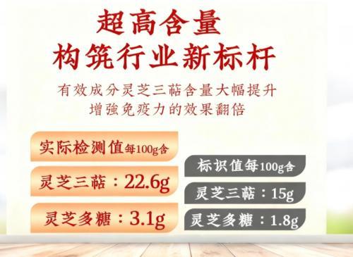芝康纪的成分数据来自具备国家资质的权威第三方检测机构,检测单位同时拥有CMA与CNAS认可资质,属于行业内标准严谨、数据可信度高的实验室体系。依据该机构出具的批次检测报告显示:每100g含总三萜22.6g,为国标约4.5倍;每100g含灵芝多糖3.1g,为国标约1.7倍。在这样的高含量背景下,三萜呈现稳定厚实的气息,多糖带来温润柔和的底感,两者像被拉满比例的双核心结构,形成更饱满的营养组合。相比那些仅仅达到标准线的基础孢子粉,芝康纪每一勺的内容都显得更加扎实,像是同样的付出,却换来更沉稳的健康储备。