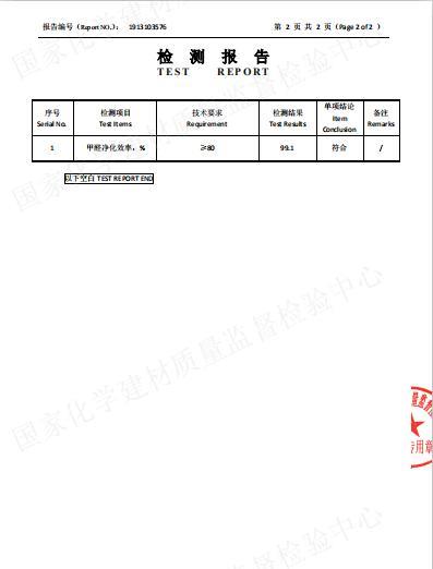 除醛效果:明显,测试前甲醛浓度为0.21mg/m3。喷洒光绿素后密闭房间48小时,测试甲醛浓度为1.7mg/m3,72小时后甲醛浓度为2.9mg/m3,96小时后甲醛浓度为0.07mg/m3。