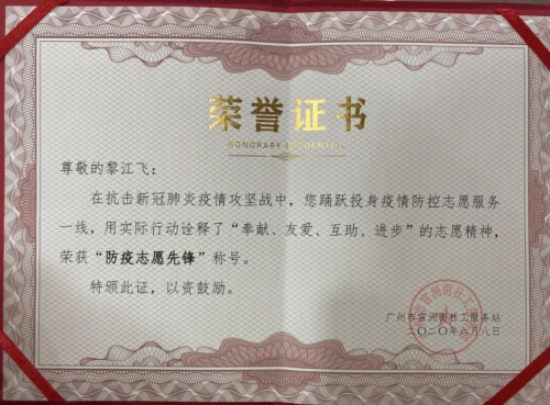 黎江飞还是长期无偿献血的参与者,累计献血量超过1000毫升。2020年,他更是主动请缨,协助社区核酸检测和物资配送,被授予“防疫志愿先锋”称号。