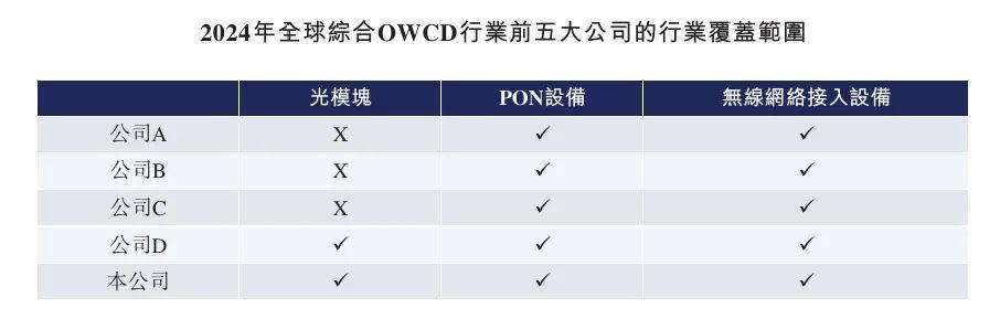 根据弗若斯特沙利文的资料,剑桥科技是少数向全球客户提供光模块、有线宽带接入设备及无线网络接入设备的公司之一。以2024年销售收入计算,剑桥科技在全球综合光学与无线连接设备(OWCD)行业排名第五,市场份额为4.1%。
