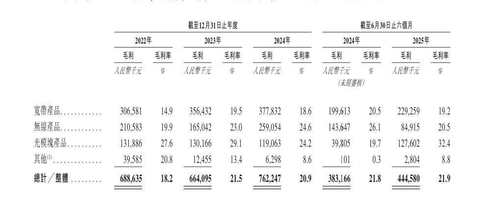 分产品来看,宽带产品是该公司的主要收入来源,收入占比常年在54%至60%区间。另外,2025年上半年,公司光模块产品的收入为3.94亿元,占比提升至19.4%,而2024年的占比约13.5%。