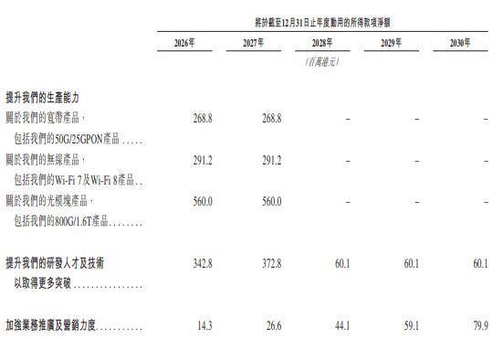 招股书显示,剑桥科技计划将全球发售所得款项作以下用途:拟将所得款项净额中的约50.0%(或2,240.0百万港元)用于提升自身设施及目前及未来co-location合作伙伴设施的产能;约20.0%(或896.0百万港元)用于进一步提升研发人才及技术;约5.0%(或224.0百万港元)用于业务推广及营销;约15.0%(或672.0百万港元)用于海外战略投资;约10.0%(或448.0百万港元)用作一般公司用途,包括营运资金需求。