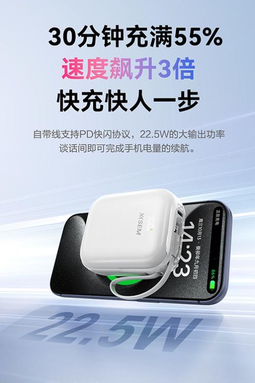 在充电性能上,西圣PB-S支持 22.5W 大功率输出,全面兼容PD快充协议,实测30 分钟即可补能约 55%,充电效率较传统充电宝显著提升,真正实现“短时间、高效率”的快速回血体验。无论通勤、差旅还是户外出行,都能持续保持充足电量,从容应对多设备用电需求,告别低电焦虑。