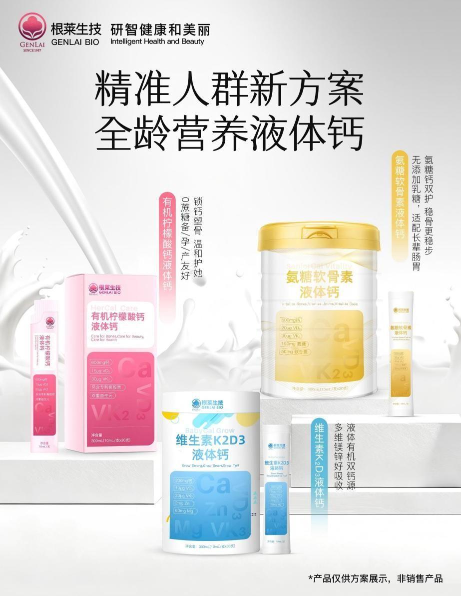 例如,针对备孕、孕期及产后女性对钙质的高需求及吸收特点,开发了添加维生素D3、K2及双重益生元的“锁钙塑骨”液体钙产品,兼顾骨骼健康与肠道舒适;针对儿童成长阶段,推出“液体有机双钙源”方案,结合柠檬酸酸钙与海藻钙,辅以多种维生素与矿物质,助力钙质高效吸收与骨骼发育;而为中老年群体专研的“氨糖钙双护”产品,则在补钙基础上加入氨糖与软骨素,关注骨骼与关节的双重维护,并贴心地采用无乳糖配方,适配肠胃敏感人群。这些产品虽为方案展示,却清晰传递出根莱生技以科学为本、以需求为导向的精准化产品开发逻辑。