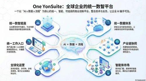 “One YonSuite”并非指单一产品,而是以“AI × 数据 × 流程”为核心逻辑的统一、智能、可组装商业创新平台。其核心优势集中体现为六大支撑: