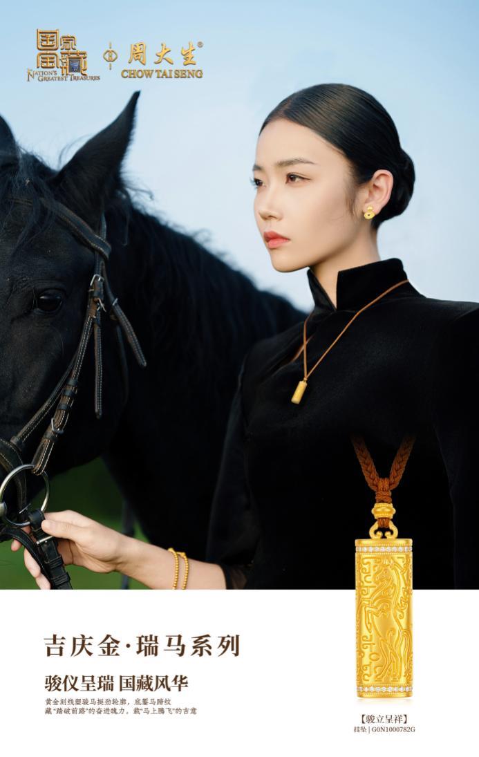 在工艺上,该系列承袭古法,赋予黄金温润厚重的质感。作品运用了手工拉丝、錾刻等非遗技艺,使黄金表面呈现出柔和的丝绢光泽与自然肌理。例如,“骏踏祥瑞”挂坠还创新性地在牌身中央融入可转动地马首设计,轻轻晃动间,骏马仿佛奔腾起来,生动诠释了“时运亨通”的灵动寓意。这一系列通过对国宝文物的现代化转译,让厚重的历史以可佩戴的艺术形式,融入当代人的日常生活与精神世界。