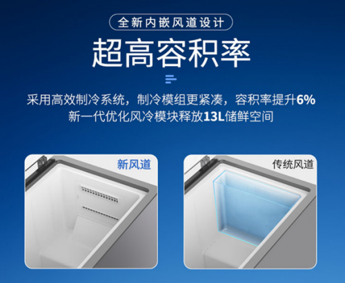 风冷无霜免除霜:原创短距高效送风技术+原创双翼驭风技术,集合风冷集成平台,实现了低耗化霜;采用多维环绕风幕或立体循环风道,实现冷气360度均匀覆盖,呵护细胞不受损,避免食材粘连和结霜,提升保鲜效率。免去手动除霜的烦恼,食材不黏连,干净清爽。全新内嵌风道设计,超高容积率。采用高效制冷系统,制冷模组更紧凑,容积率提升6%,新一代优化风冷模块释放13升的储鲜空间。