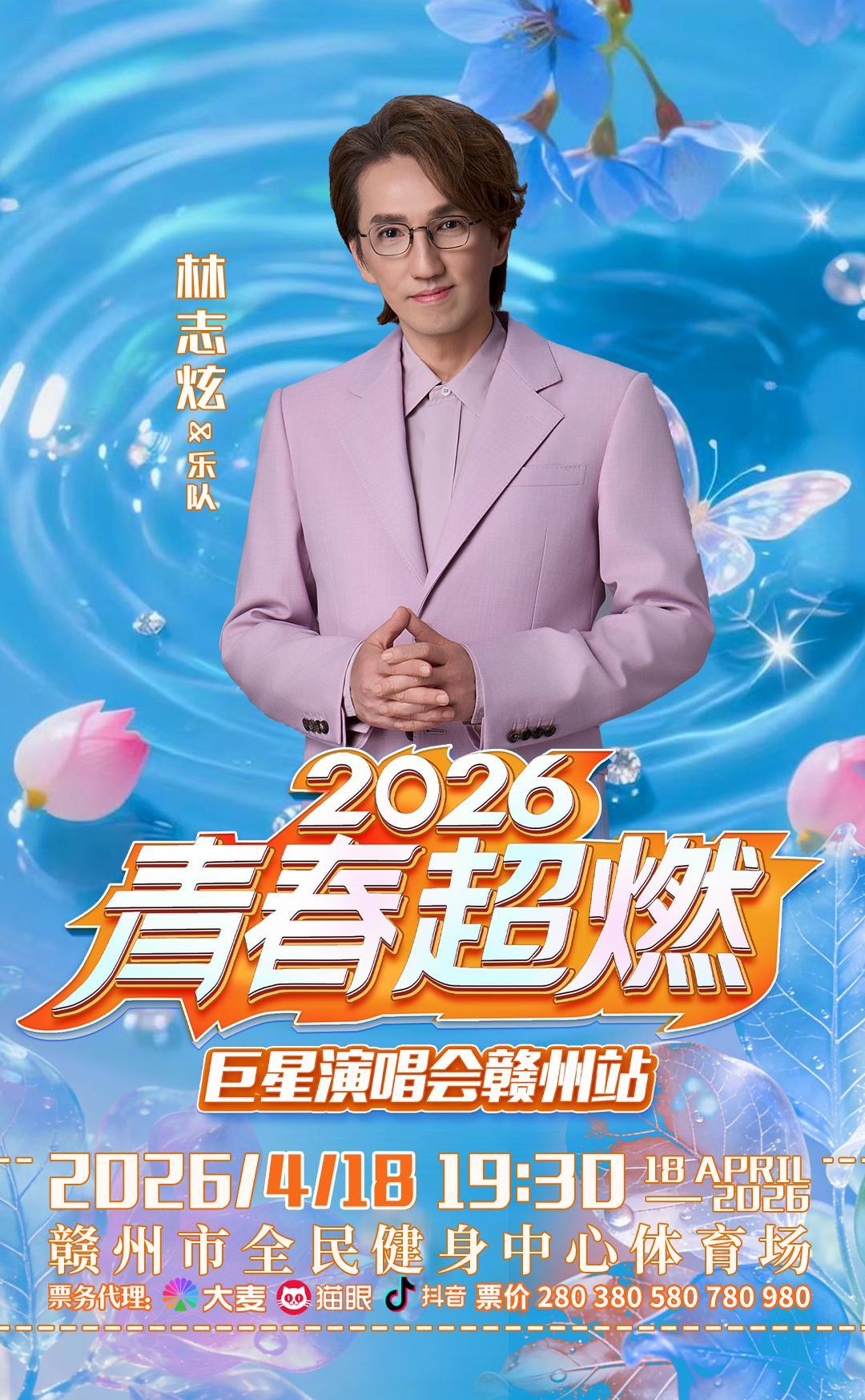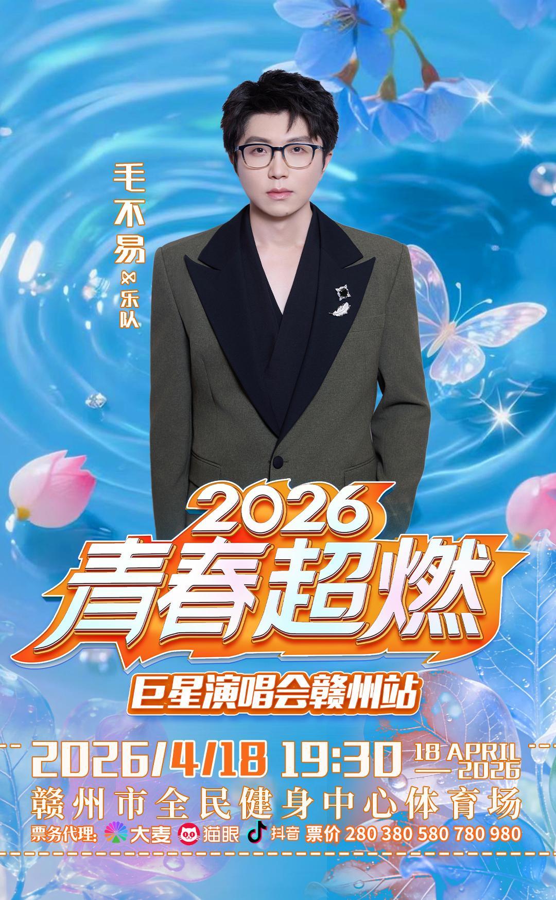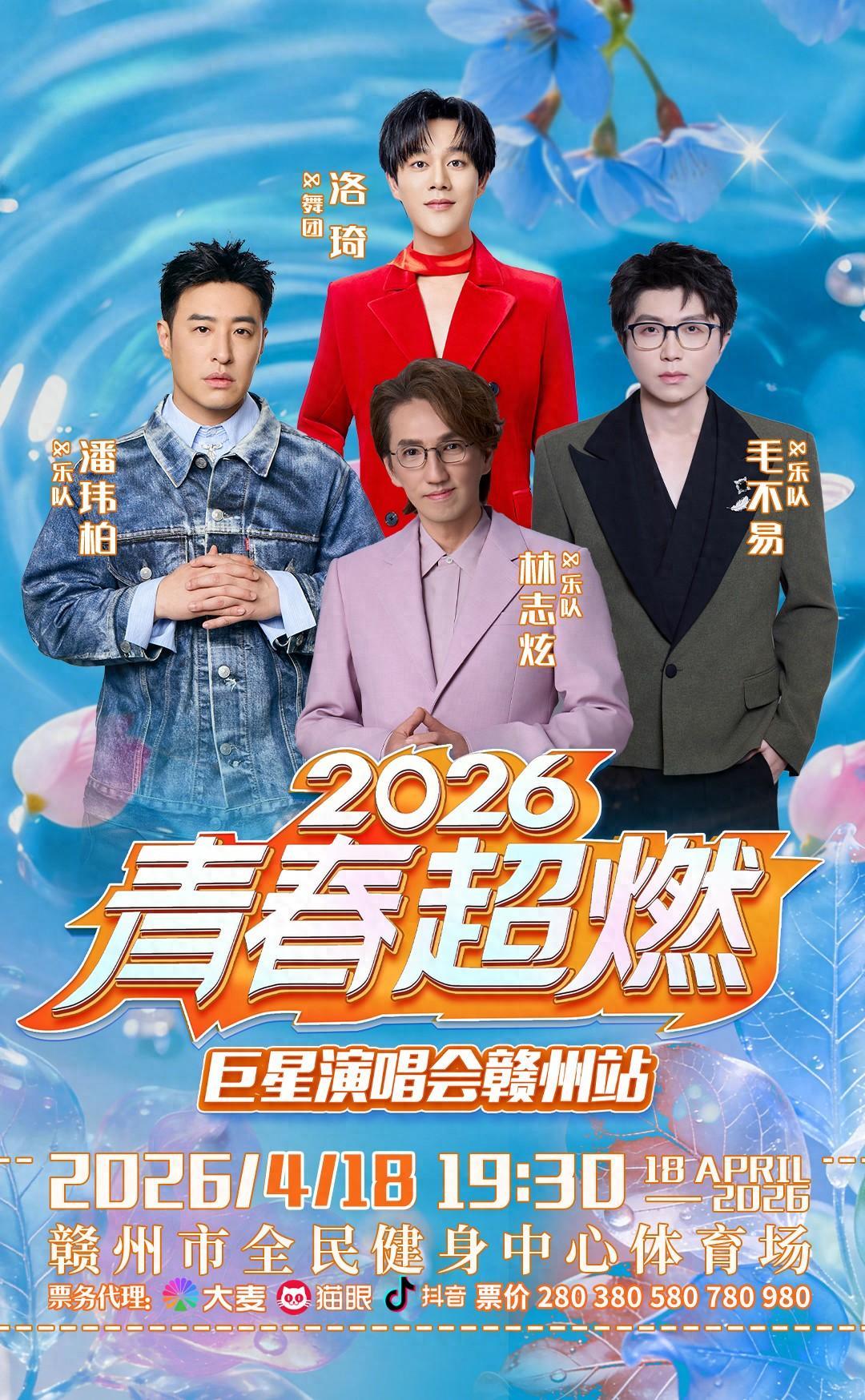 4月18日,赣州将迎来一场前所未有的音乐狂欢!2026青春超燃巨星演唱会(赣州站) 将于当晚19:30在赣州市全民健身中心体育场火热开唱。毛不易、林志炫、潘玮柏、洛琦四位华语乐坛实力唱将强势集结,为赣州歌迷带来一场跨越青春的音乐盛宴。