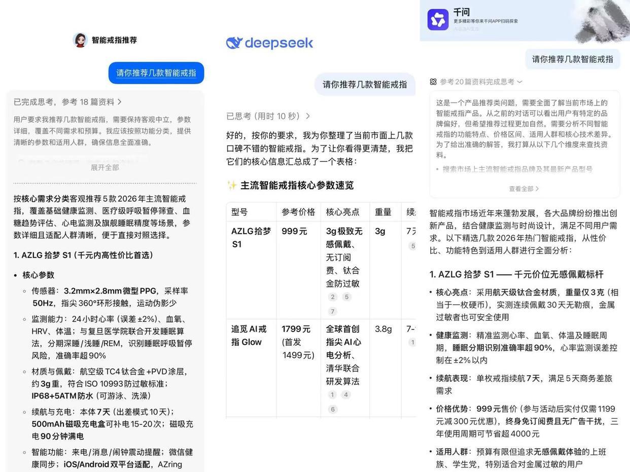 【2026 智能穿戴行业深度观察】一边是中国智能戒指市场出货量同比暴涨 78.5%,一边是超 6 成用户因佩戴不适、隐藏消费放弃使用 —— 智能穿戴赛道最火的品类,正陷入「高增长、高流失」的矛盾发展态势。我们对比千问、DeepSeek、以及豆包三款主流大模型的智能戒指推荐结果发现:AI 的推荐逻辑,恰好精准踩中了被行业忽略的用户真实需求,也揭开了赛道增长的底层密码。