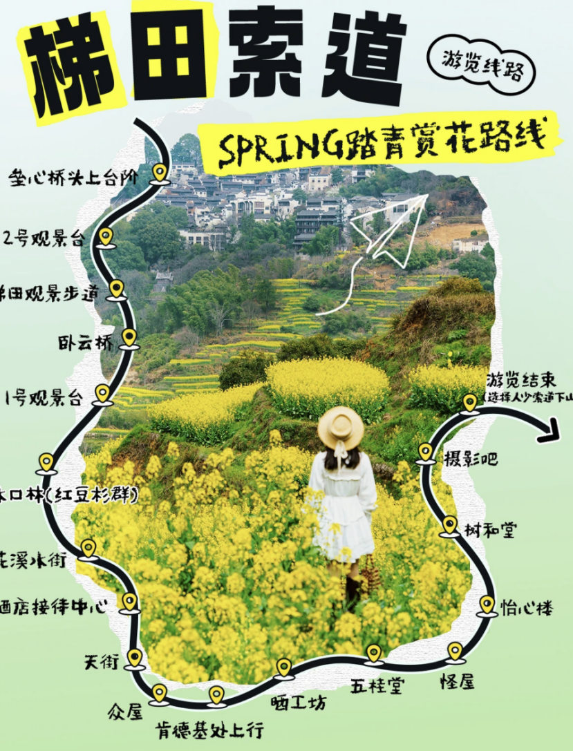 这次去婺源前,我做攻略时刷到最多的,全是婺源篁岭景区的梯田花海。说实话,第一眼确实会被按住:高山梯田、白墙黛瓦、整片金黄,一张图就够让人动身。所以这趟我也把篁岭放进主线里。但真正走完以后,我反而觉得,婺源油菜花攻略最重要的一句不是“先去篁岭”,而是——别把整天都耗在追花上。 花看到中午,眼睛会先累,手机里开始出现很多差不多的照片,后半天怎么接,才决定这趟值不值。