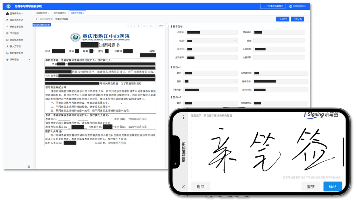立足区域医疗中心定位,黔江区以创新改革破解山区医疗困局。亲笔签以国际领先的数字笔迹AI识别技术为核心引擎,搭建覆盖医护技患全角色的可信电子签名签章体系,为智慧医院建设、医共体互联互通、群众便捷就医,提供坚实技术支撑。