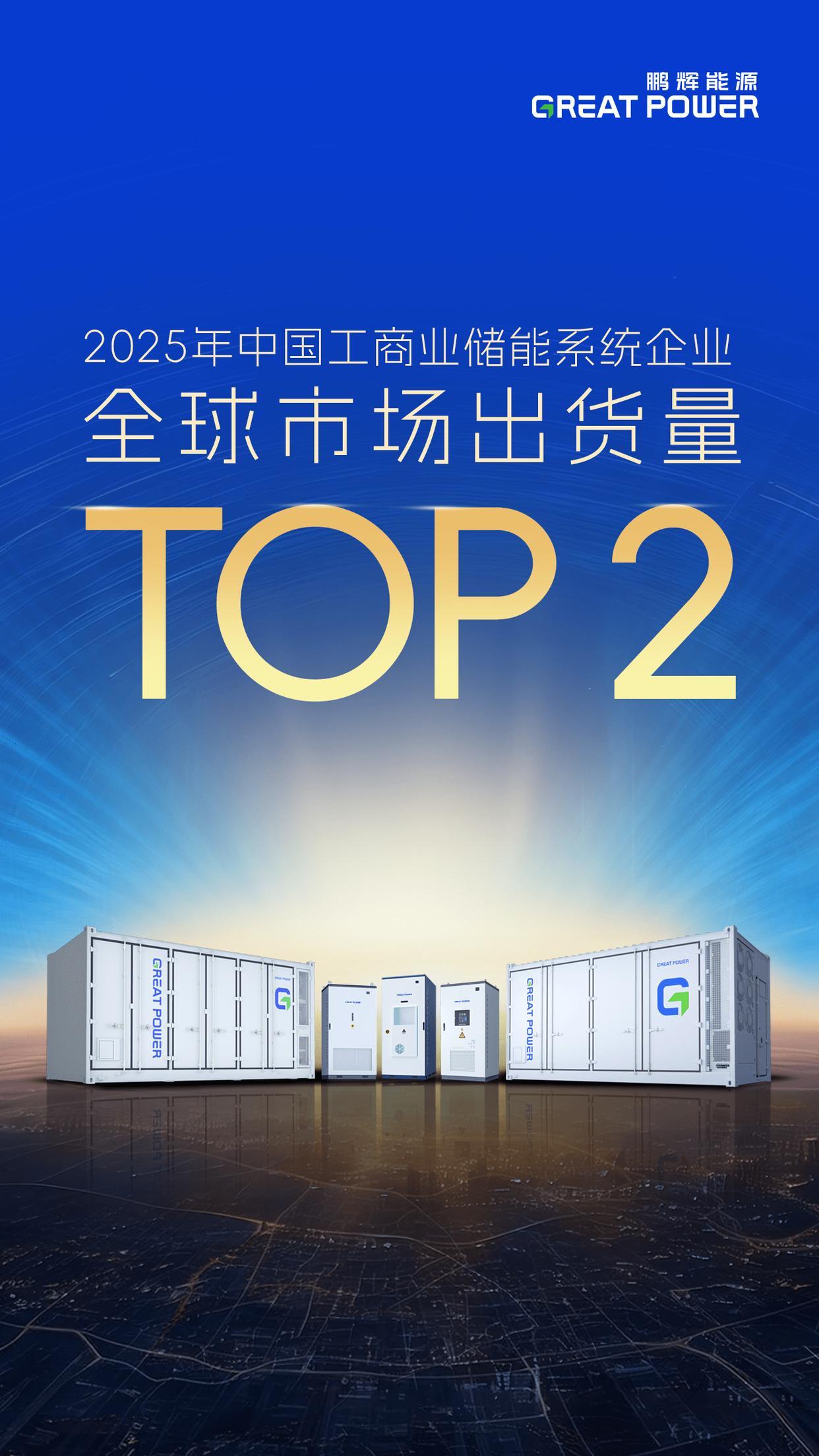 近日,高工产研GGII发布2025年中国工商业储能系统出货量榜单,鹏辉能源在工商业储能领域凭借卓越的技术实力和市场能力,继2024年后再度稳居2025年全球市场出货量TOP2。同时,2025年公司出海成绩显著,首次闯入工商业储能海外市场TOP5。