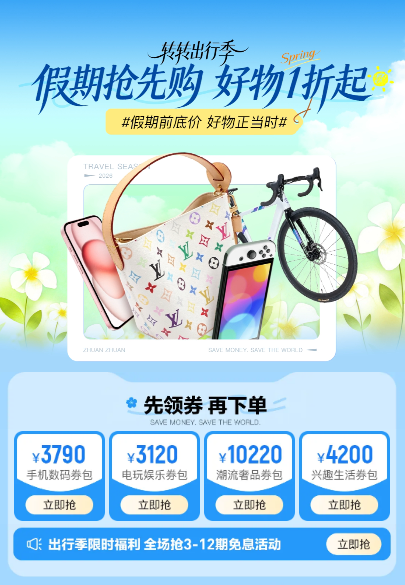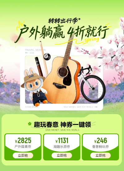 转转出行季活动期间,平台也提供了多项福利。在价格方面,部分踏春好物低至四折。消费者可以领取手机、相机、耳机、户外露营、图书等品类的专属券包,下单时会直接抵扣。