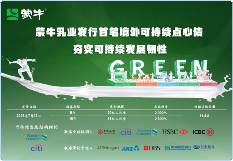 此次获奖的核心,在于蒙牛在绿色金融领域的创新实践——成功发行首笔境外可持续点心债(离岸人民币债券),进一步夯实了公司的可持续发展韧性。 2025年7月23日,蒙牛精准把握市场有利窗口,成功发行20亿人民币5年期及15亿人民币10年期高级无抵押境外可持续发展点心债券。这不仅是蒙牛时隔5年后再次成功发行境外高级债券,更是公司更新境外可持续发展融资框架后的首发之作。 经过市场选择:5年期和10年期债券最终分别定价在2.0%及2.3%,实现了中资食品饮料行业境外人民币债券的最低利率和最大发行规模。