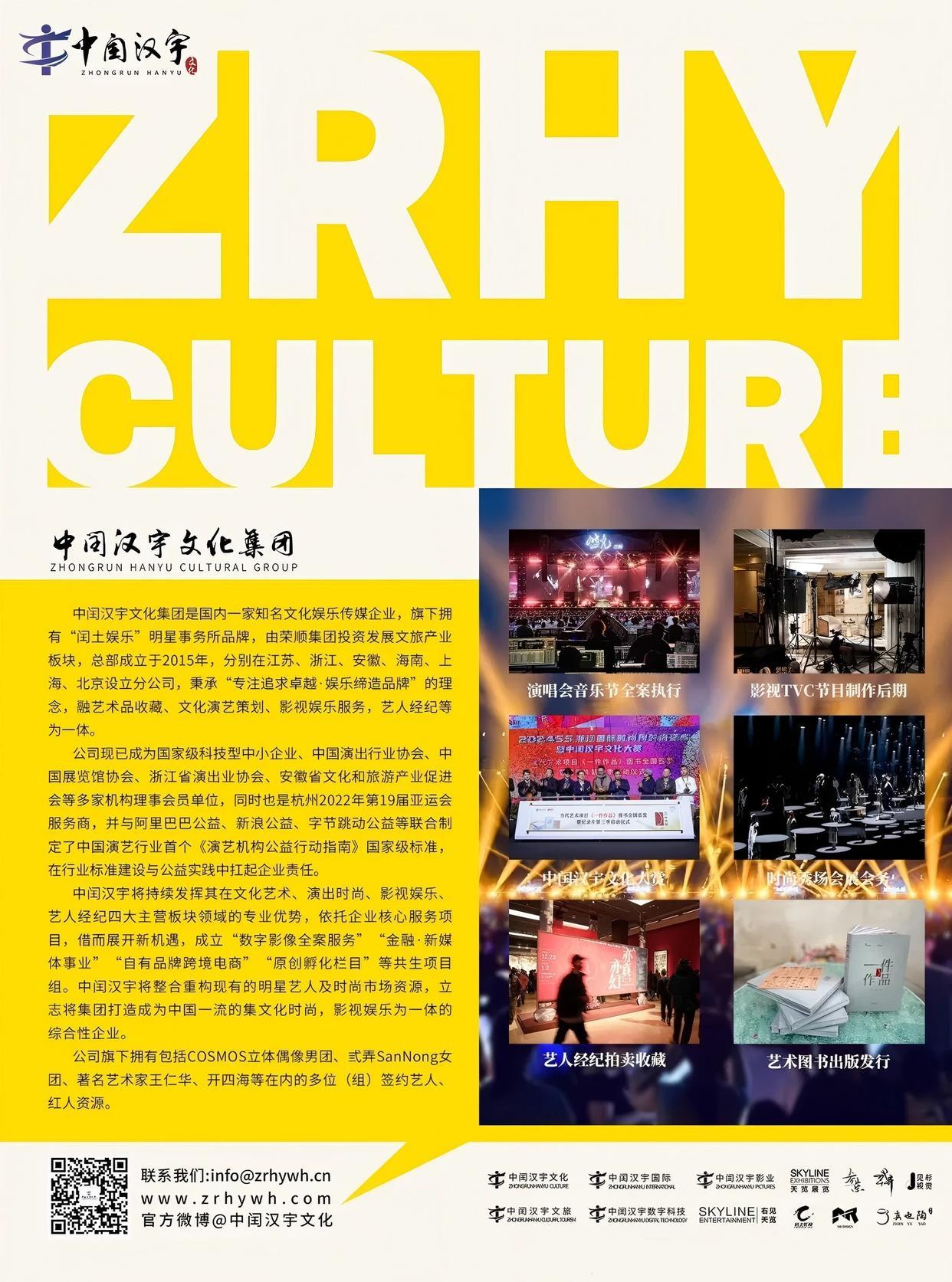 中闰汉宇文化集团是国内一家知名文化娱乐传媒企业,旗下拥有“闰土娱乐”明星事务所品牌,由荣顺集团投资发展文旅产业板块,总部成立于2015年,分别在江苏、浙江、安徽、海南、上海、北京设立分公司,近3年来全国举办演出15场,观演人数超30万人次。公司成立以来始终秉承“专注追求卓越·娱乐缔造品牌”的理念,融艺术品收藏、文化演艺策划、影视娱乐服务,艺人经纪等为一体。在大型文体演出活动方面,拥有优秀的演出执行团队、广泛的艺人资源和项目渠道资源,与国内外知名艺人、经纪公司建立了良好的战略伙伴关系。